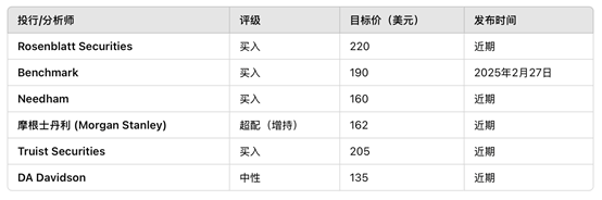 以下是最新的美国投行和分析师对英伟达的评级和目标价整理总结。最高目标价为220 美元,最低目标价为135 美元,大多数分析师维持“买入”评级,目标价集中在160-220美元之间。