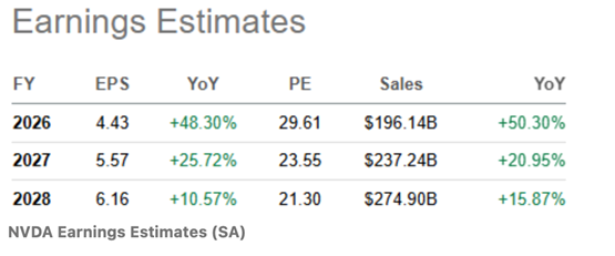 从收入增长的角度来看,英伟达2026年的收入增长预计将达到50%,这将显著改善其市销率(P/S ratio)。而2027年21%的收入增长预测虽然较高,但基于公司在AI和数据中心领域的强劲增长潜力,这一预测仍显得相对保守。此外,英伟达已上调下一季度的业绩指引,显示出管理层对未来的信心。因此,有分析师认为,一旦当前市场的调整(下跌趋势)结束,英伟达股价有望从当前约120美元的水平显著回升。基于从-54%的PEG折价中恢复80%的假设,分析师对英伟达未来12个月的目标价设定为220美元。综合来看,英伟达的低估值、强劲的盈利增长潜力以及行业领先的毛利率水平,使其成为当前市场中极具吸引力的投资标的。