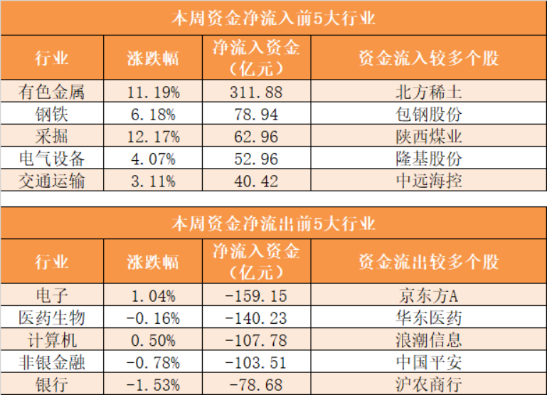 28个申万一级行业中,本周8个行业实现资金净流入,其中有色金属行业净流入311.88亿元居首。