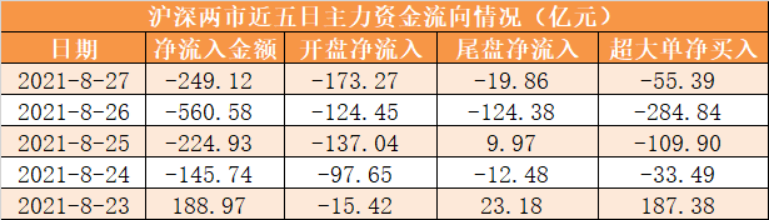 本周两市主力资金累计净流出991.40亿元。其中周五(8月27日)主力资金开盘净流出173.27亿元,尾盘净流出19.86亿元,全天净流出249.12亿元。