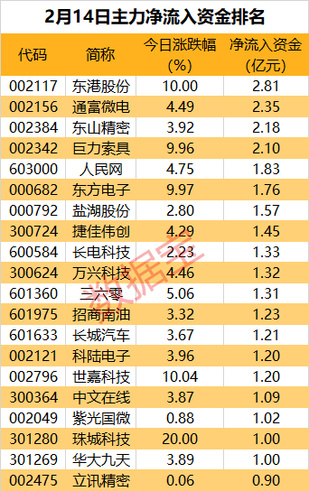 从个股来看,共有17股主力资金净流入超1亿元。东港股份获主力资金净流入2.81亿元居首。该股今日涨停,龙虎榜上榜营业部席位全天成交1.98亿元,占当日总成交金额比例为16.78%。其中,买入金额为1.37亿元,卖出金额为6063.08万元,合计净买入7666.39万元。