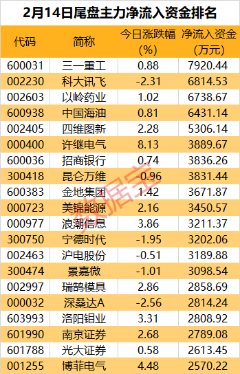 从个股看,有5股尾盘净流入资金超5000万元,三一重工连续两日获主力尾盘抢筹居首。据2月13日数据,以增持的股份数量和当日收盘价为基准进行测算,三一重工获北上资金增持市值最多,最新持股量为7.32亿股,环比增加6.92%,增持市值为8.62亿元。