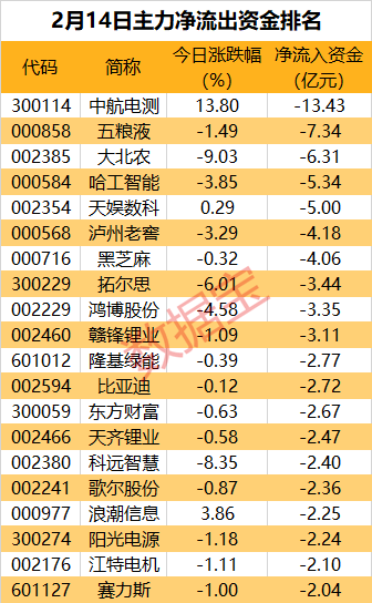 数据宝统计,63股遭主力资金净流出超1亿元。中航电测遭净卖出13.43亿元,流出金额居首,该股今日收涨13.8%,止步八连板。其后净卖出居前的个股为五粮液和大北农,净流出资金分别为7.34亿元、6.31亿元。