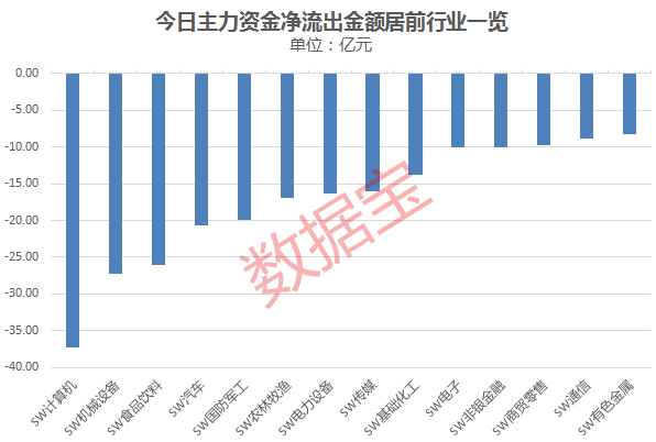 资金流向上,仅银行、钢铁两行业获资金净流入,金额分别为1.59亿元、9626.66万元。主力资金净流出的29个行业中,计算机行业流出规模居首,全天净流出37.34亿元;其次是机械设备、食品饮料、汽车行业,净流出均超20亿元。