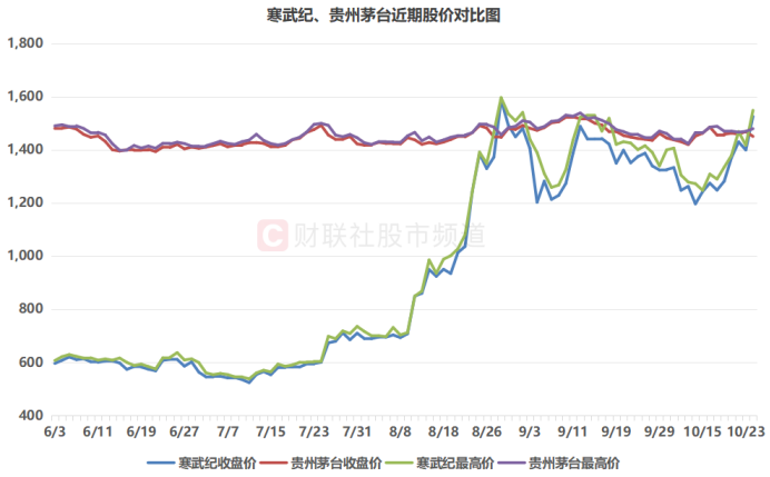 注:寒武纪、贵州茅台近期股价对比图(截至10月24日收盘)