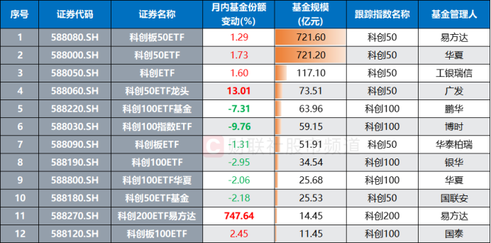 注:跟踪科创50、科创100、科创200指数的12只ETF月内份额变动情况(截至10月23日数据)