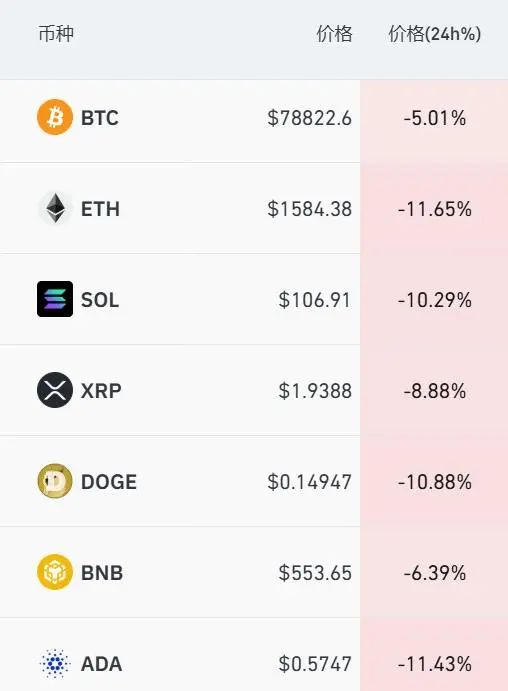 加密货币全线大跌,比特币跌逾5%,跌破79000美元/枚;以太坊暴跌超11%。最近24小时,全球共有超24万人爆仓。