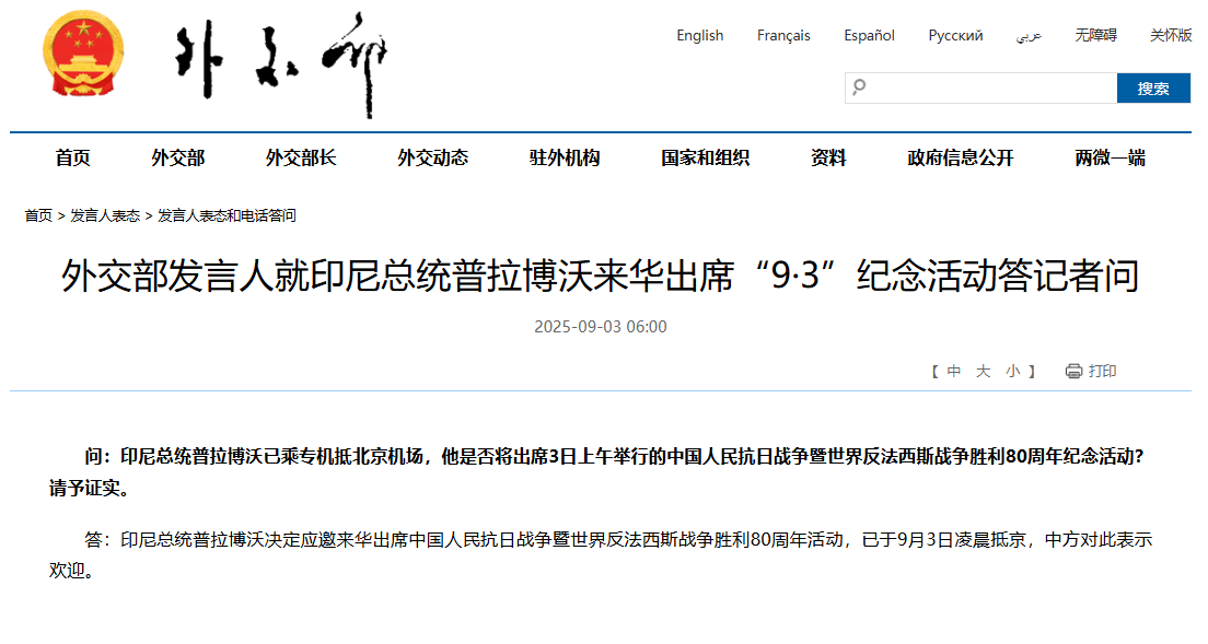 9月3日讯,据外交部网站消息,外交部发言人就印尼总统普拉博沃来华出席“9·3”纪念活动答记者问。