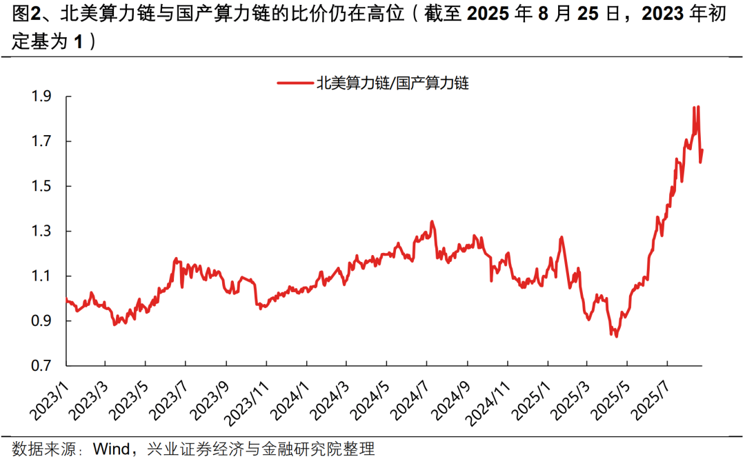 北美算力与国产算力比价来看,仍在高位。我们精选A股中20家北美算力链标的(光模块、PCB等方向)与20家国产算力链标的(国产芯片产业链、服务器等方向),分别构建“北美算力链”与“国产算力链”指数。两者比价来看,4月下旬以来北美算力链已在持续跑赢国产算力链,近期国产算力大涨后,两者比价仍在高位。