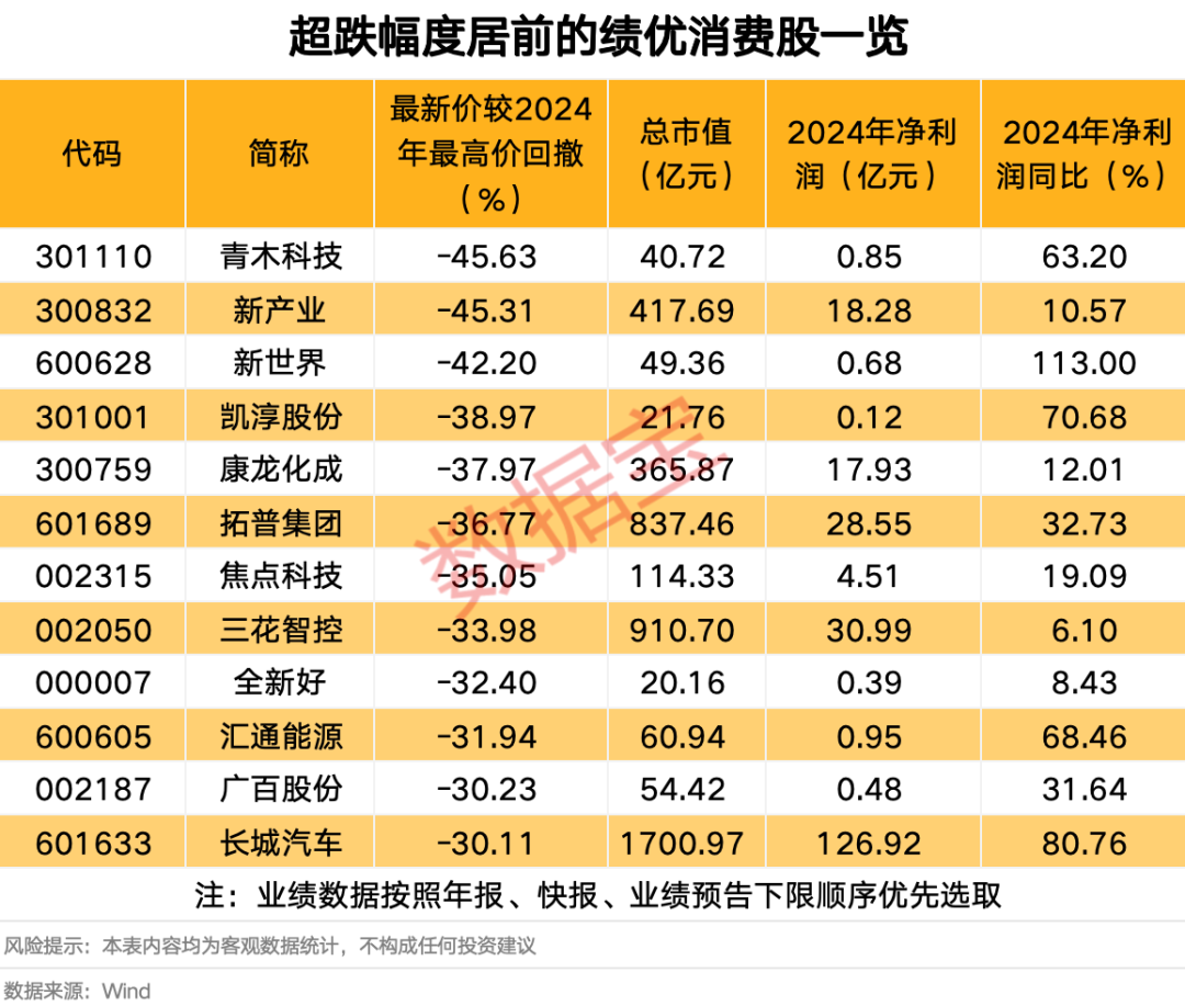 结合业绩数据来看,超跌股中不乏有一些绩优股标的。长城汽车的2024年净利润规模最高,公司营业总收入2021.95亿元,同比增长16.73%,归母净利润为126.92亿元,同比增长80.76%,业绩创新高。公司最新股价为23.3元/股,较2024年高点回撤30.11%。