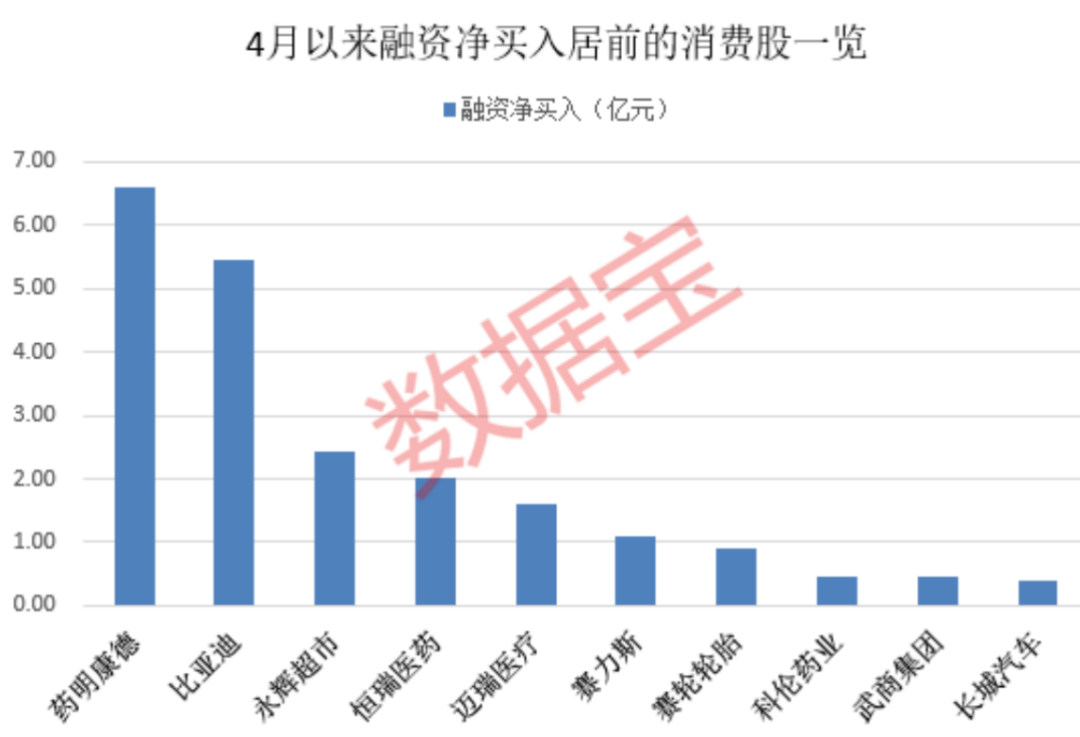 据证券时报·数据宝统计,4月以来,不少消费股获得杠杆资金加仓,药明康德、比亚迪、永辉超市、恒瑞医药等6股均获得杠杆资金超亿元加仓,其中,药明康德的净买入金额最高,月内获得6.6亿元杠杆资金加仓。