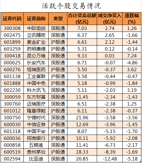 活跃个股方面,北向资金今日净买入的有中际旭创、立讯精密、紫金矿业、药明康德、昆仑万维,净买入金额分别为2.74亿元、2.65亿元、2.12亿元、0.12亿元、0.03亿元。北向资金净卖出较多的有比亚迪、贵州茅台、五粮液、招商银行、中国平安,净卖出金额分别为12.48亿元、8.39亿元、6.73亿元、5.92亿元、5.15亿元。