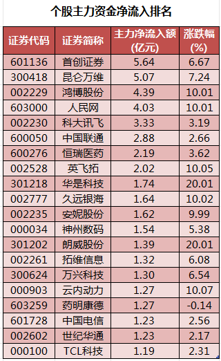 个股来看,今日有1542只个股获主力资金净流入,其中,24股获主力资金净流入超1亿元。首创证券获主力资金净流入最多,净流入金额为5.64亿元;主力资金净流入居前的个股还有昆仑万维、鸿博股份、人民网、科大讯飞、中国联通,流入金额分别为5.07亿元、4.39亿元、4.03亿元、3.33亿元、2.88亿元。