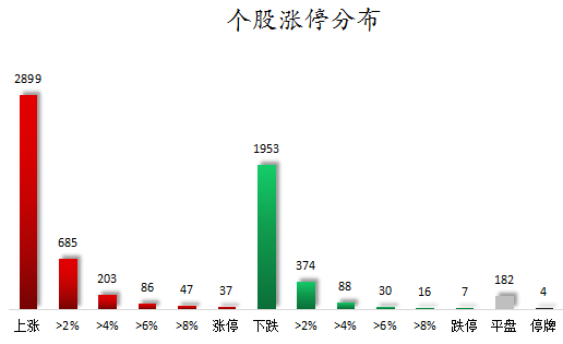 截至收盘,沪深两市合计2899只个股上涨,1953只个股下跌,平盘个股182只,停牌的个股4只。不含当日上市新股,共有37只个股涨停,7只个股跌停。连续涨停天数看,*ST西发已连收4个涨停板,连续涨停板数量最多。