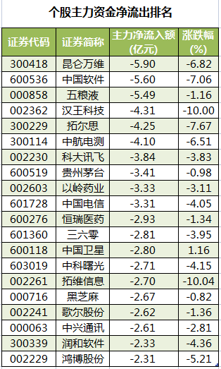 此外,3245只个股被主力资金净卖出,其中,65股被主力资金净卖出超1亿元。主力资金净流出最多的个股是昆仑万维,净流出金额为5.9亿元;主力资金净流出居前的个股还有中国软件、五粮液、汉王科技、拓尔思、中航电测,净流出金额分别为5.6亿元、5.49亿元、4.31亿元、4.25亿元、4.1亿元。