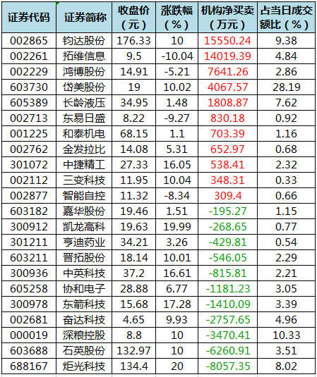 盘后龙虎榜数据显示,今日机构席位资金合计净买入约2.11亿元。其中,净买入的个股11只,净卖出的个股11只。机构净买入最多的股票是钧达股份,净买入金额约1.56亿元;机构净买入居前的还有拓维信息、鸿博股份、岱美股份等股。机构净卖出最多的股票是炬光科技,净卖出金额约8057.35万元;机构净卖出居前的还有石英股份、深粮控股、奋达科技等股。