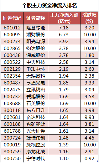 个股来看,今日有1665只个股获主力资金净流入,其中,24股获主力资金净流入超1亿元。隆基绿能获主力资金净流入最多,净流入金额为7.18亿元;主力资金净流入居前的个股还有湘财股份、阳光电源、钧达股份、通威股份、中天科技,净流入金额分别为6.73亿元、3.92亿元、3.78亿元、3.78亿元、2.58亿元。