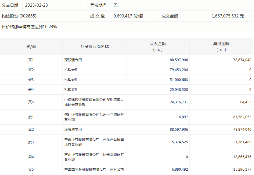 钧达股份今天涨停。盘后数据显示,3个机构出现在龙虎榜单上,合计净买入约1.56亿元;中信建投证券股份有限公司深圳滨海大道证券营业部买入2431.67万元,同时卖出8.45万元;中泰证券股份有限公司上海花园石桥路证券营业部买入1537.45万元,同时卖出2136.15万元。