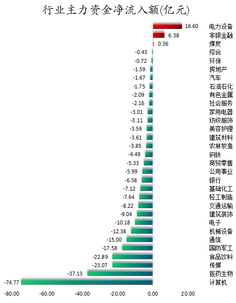 从行业板块来看,申万所属的31个一级行业,今日仅有电力设备、非银金融、煤炭3个行业板块主力资金呈现净流入,净流入金额分别为16.6亿元、6.38亿元、0.36亿元。28个行业板块主力资金呈现净流出,其中,计算机行业板块主力资金净流出最多,净流出金额为74.77亿元;行业板块主力资金净流出靠前的还有医药生物、传媒、食品饮料、国防军工、通信,净流出金额分别为37.13亿元、23.07亿元、22.89亿元、17.58亿元、15亿元。