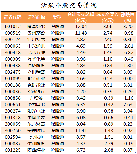 活跃个股方面,北向资金今日净买入较多的有隆基绿能、贵州茅台、汇川技术、中兴通讯、昆仑万维,净买入金额分别为3.96亿元、2.74亿元、2.4亿元、1.59亿元、1.49亿元。北向资金净卖出较多的有陕西煤业、伊利股份、比亚迪、宁德时代、东方财富,净卖出金额分别为2.68亿元、2.29亿元、1.51亿元、1.43亿元、0.89亿元。