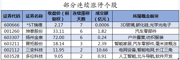 截至收盘,沪深两市合计1822只个股上涨,2882只个股下跌,平盘个股213只,停牌的个股7只。不含当日上市新股,共有26只个股涨停,5只个股跌停。连续涨停天数看,*ST瑞德已连收7个涨停板,连续涨停板数量最多。