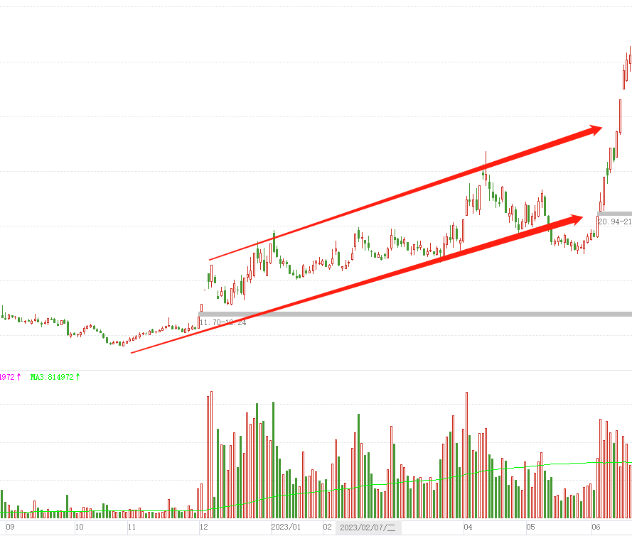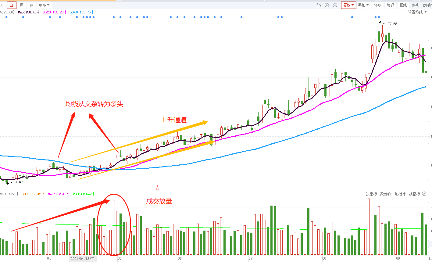 简单概括就是,量能放大+上升通道+均线转为多头,三点我们将之确认为上涨行情初期。