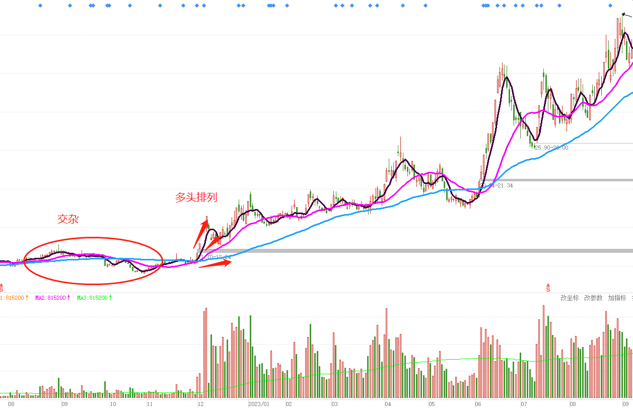 以此类推,其他的均线随着时间周期的拉长,就会错落有致地出现在下方。所以上涨最初的均线方式一定是从交杂整理,变为多头排列。