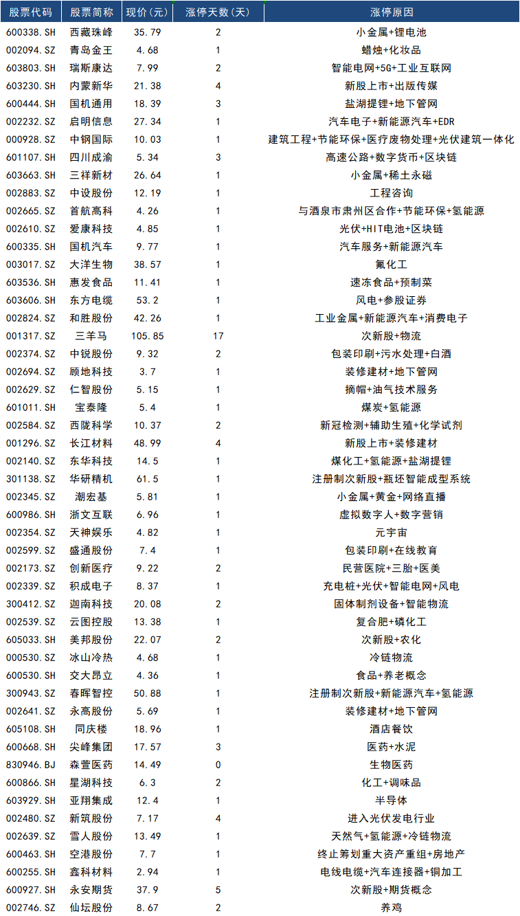 按行业来看,其他涨停个股零星分布于盐湖提锂、风电、氢能源和氟化工等板块。