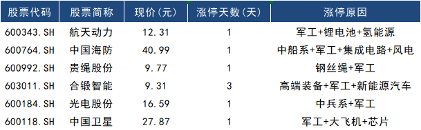 同样受消息面提振上涨的还有军工板块,今日军工概念股逆势上扬,航天动力(600343.SH)、中国卫星(600118.SH)、中国海防(600764.SH)等多股涨停。