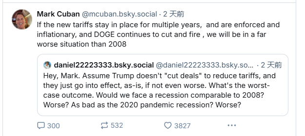 库班在社交媒体网站Bluesky网站上写道:“如果新的关税持续多年,并被强制执行、引发通货膨胀,而DOGE继续削减和解雇,我们的情况将比2008年糟糕得多。”