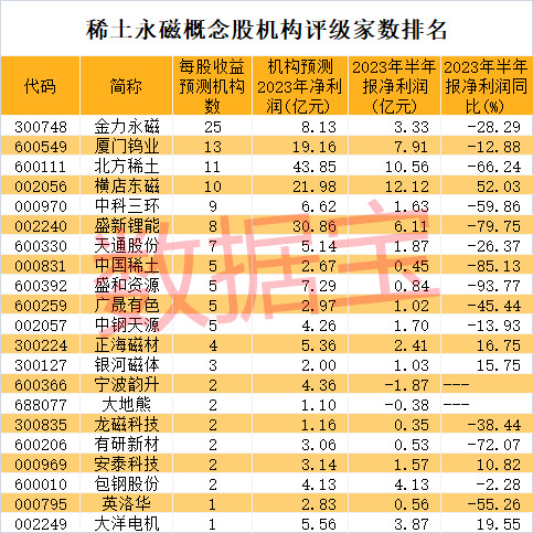 从机构关注度来看,目前机构评级家数最多的是金力永磁,共25家机构给予该股“积极型”评级。其次是厦门钨业、北方稀土、横店东磁等。