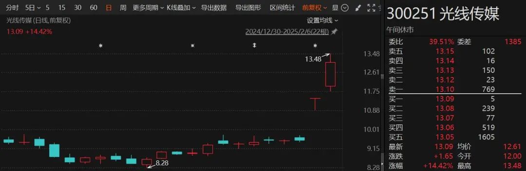 2月5日,光线传媒股价20%涨停,截至收盘封单超过14万手。2月6日,光线传媒股价再度大涨超14%。