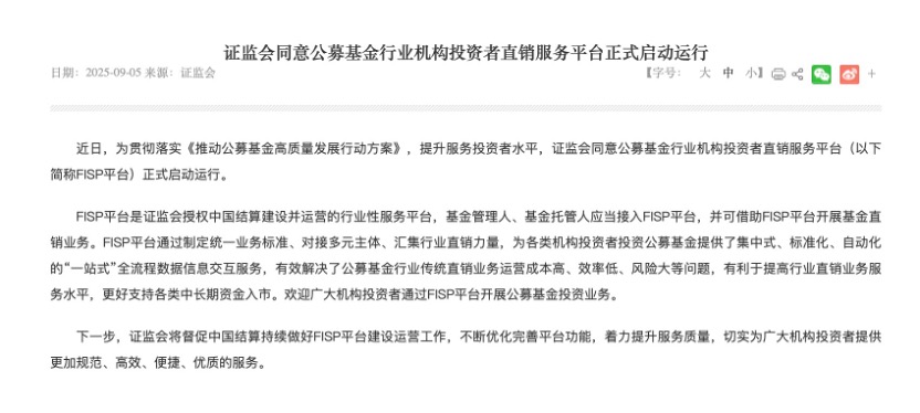 证监会推出FISP平台,鼓励基金公司壮大直销渠道