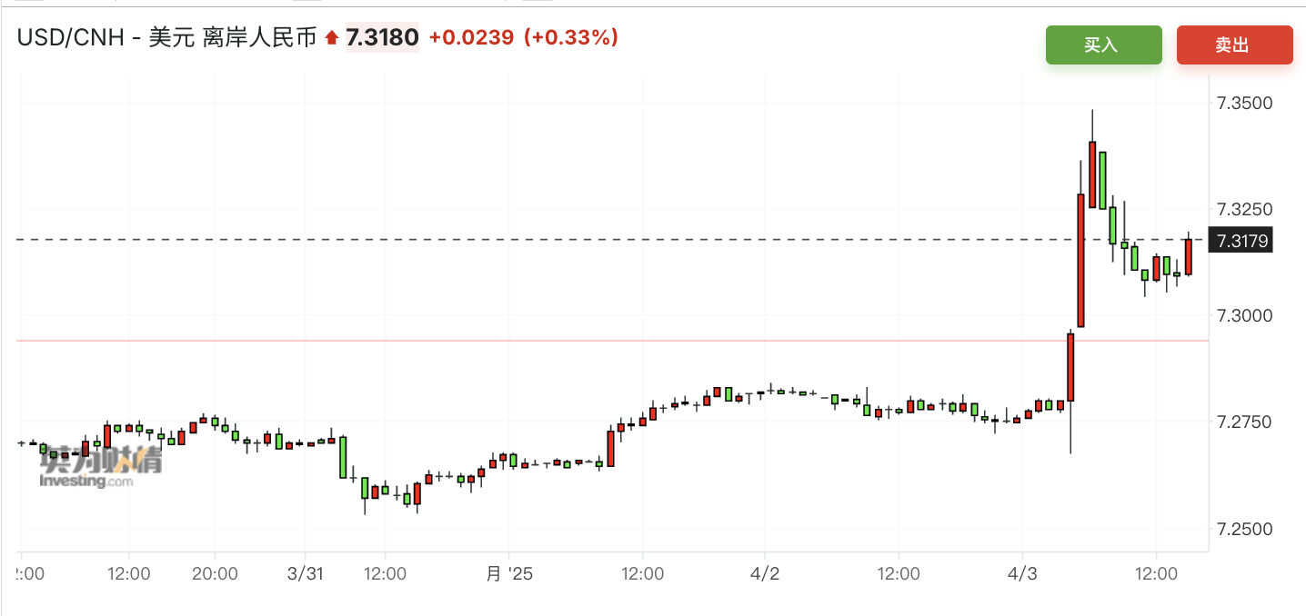 然而,4月3日,离岸人民币对美元一度突破7.35大关,中间价释放的信号更是引发关注,相较前一日大幅调贬96点至7.1889,突破了7.17区间。