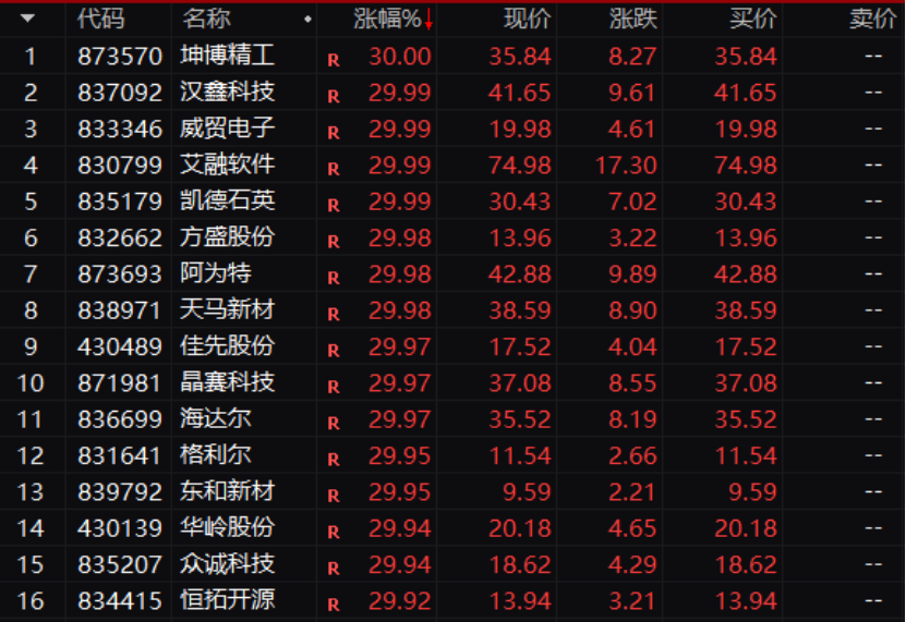 10月18日,艾融软件、天马新材、坤博精工、凯德石英、汉鑫科技、威贸电子、方盛股份、阿为特等16只北交所个股30%涨停。