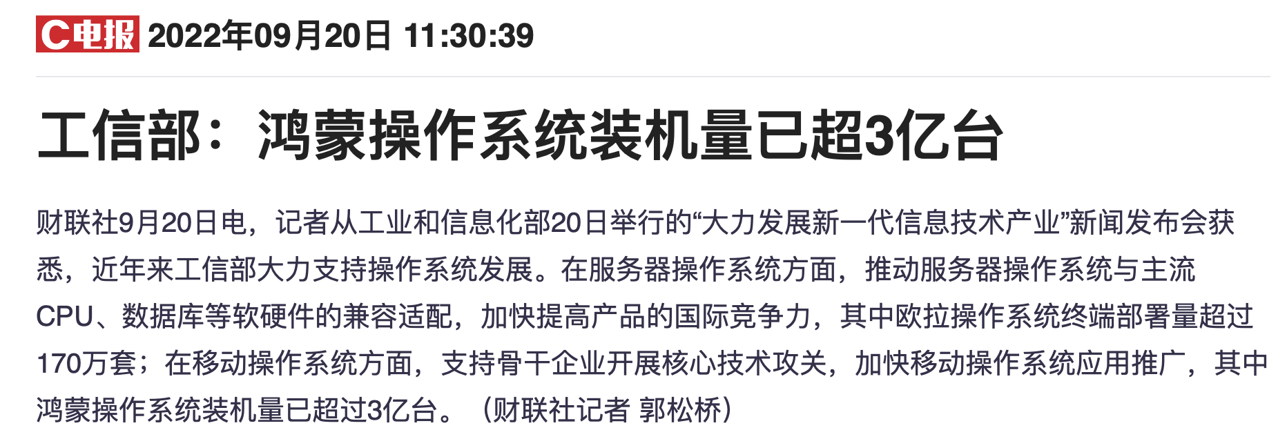记者从工业和信息化部举行的“大力发展新一代信息技术产业”新闻发布会获悉,近年来工信部大力支持操作系统发展。在服务器操作系统方面,推动服务器操作系统与主流CPU、数据库等软硬件的兼容适配,其中欧拉操作系统终端部署量超过170万套;在移动操作系统方面,加快移动操作系统应用推广,其中鸿蒙操作系统装机量已超过3亿台。