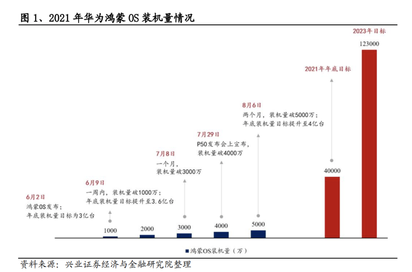 值得注意的是,据央视财经于去年8月8日的报道,自鸿蒙OS发布以来,两个月时间里用户量已突破5000万。此外,华为官方表示,2023年鸿蒙OS装机量目标为12.3亿台。据计算,若华为顺利完成装机目标,将实现3年内23.6倍的装机量增长。