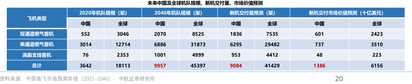 根据中国商飞市场预测年报(2021-2040),未来二十年,全球航空旅客周转量(RPKs)将以平均每年3.9%的速度递增,中国航空旅客周转量将以平均每年5.7%的速度增长;预计将有约41429架新飞机交付,价值约6.1万亿美元(以2020年目录价格为基础);中国的航空公司将接收其中的9084架新机,市场价值约1.4万亿美元(以2020年目录价格为基础);到2040年,中国占全球客机机队比例将从现在的20%增长到22%,为全球最大的单一航空市场。