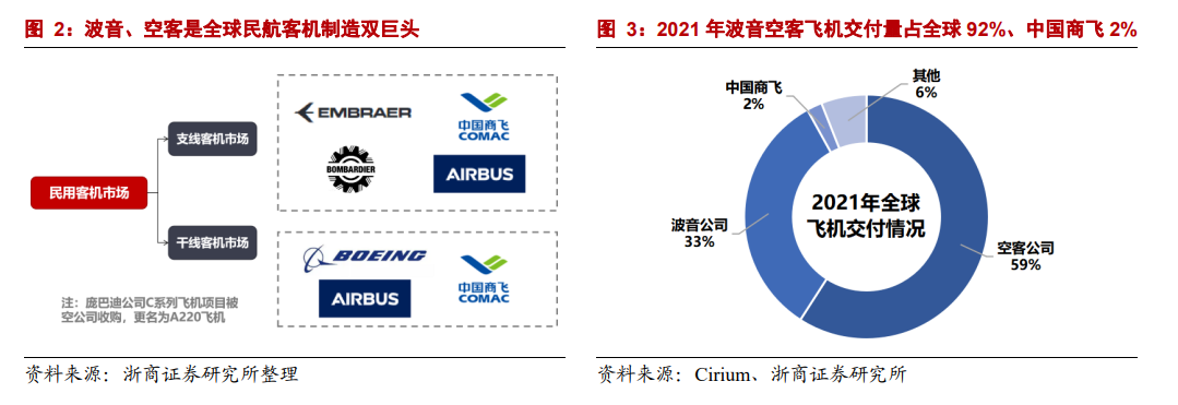 长期以来,美国波音公司(BOEING)、欧洲空中客车公司(AIRBUS)几乎垄断了全球民用干线客机市场。巴西航空工业公司(EMBRAER)、加拿大庞巴迪公司(BOMBARDIER)专注于支线客机市场。其中,庞巴迪公司C系列飞机项目于2018年被空客公司收购。波音公司于2018年启动收购巴航工业商用飞机部门,于2020年停止。从交付情况看,2021年,全球商用飞机交付量1034架,其中波音公司交付340架、空客公司交付611架,占全球交付量的92%。