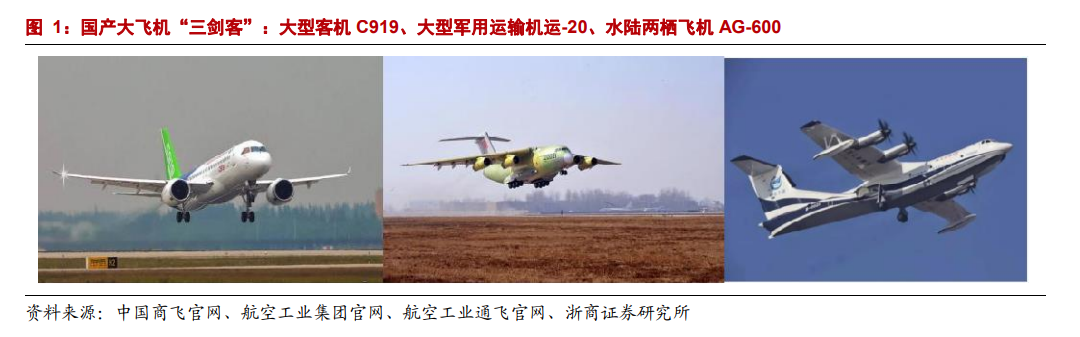 大飞机一般是指起飞总重超过100吨的运输类飞机,包括民用运输类飞机和军用运输类飞机。目前,中国最新大型客机C919、大型军用运输机运20“鲲鹏”和水陆两栖飞机AG-600“鲲龙”共同组成了中国大飞机“三剑客”。