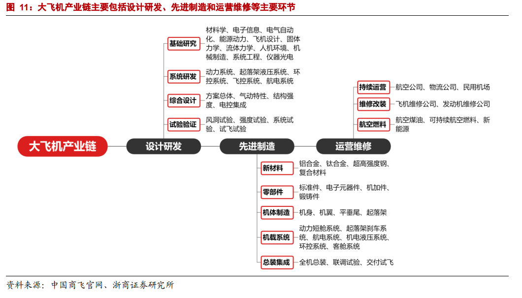 浙商证券研报指出,大飞机产业链可主要分为以下环节:设计研发(基础研究、系统研发、综合设计、试验验证)、先进制造(新材料、零部件、机体制造、机载系统、总装集成)、运营维修(维修改装、持续运营、航空燃料)等。