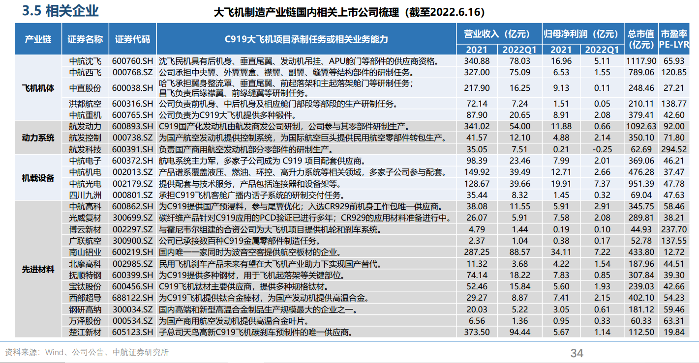 运营维修:由飞机、发动机维修公司负责维修改装,航空公司、物流公司和民用机场为大飞机持续运营建立相应配套服务。能源化工企业是航空燃料主要提供方。