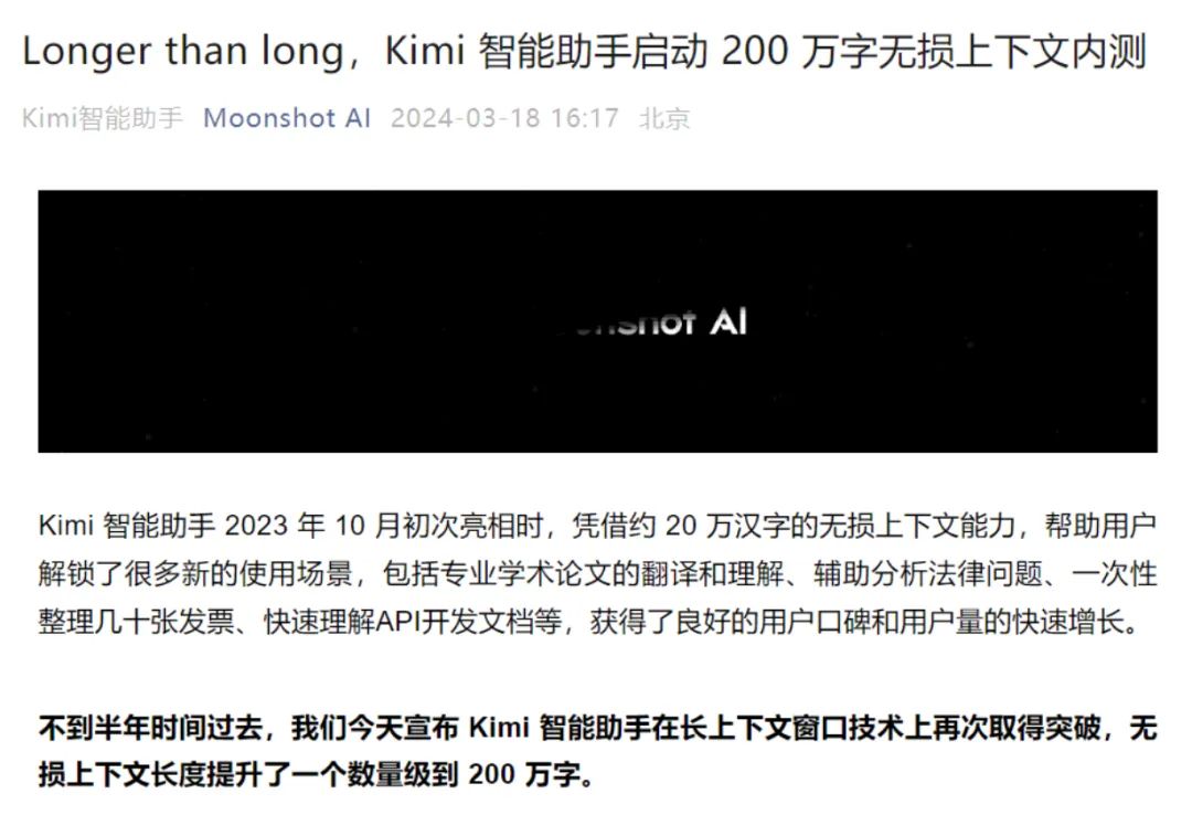 而就在昨天,Kimi的开发商月之暗面发布了最新消息。Kimi 智能助手2023 年10月初次亮相时,凭借约20万汉字的无损上下文能力,帮助用户解锁了很多新的使用场景,包括专业学术论文的翻译和理解、辅助分析法律问题、一次性整理几十张发票、快速理解API开发文档等,获得了良好的用户口碑和用户量的快速增长。“不到半年时间过去,我们今天宣布 Kimi 智能助手在长上下文窗口技术上再次取得突破,无损上下文长度提升了一个数量级到 200 万字。”