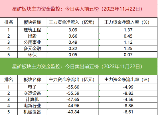 板块资金流出方面,电子板块主力资金净流出居首。