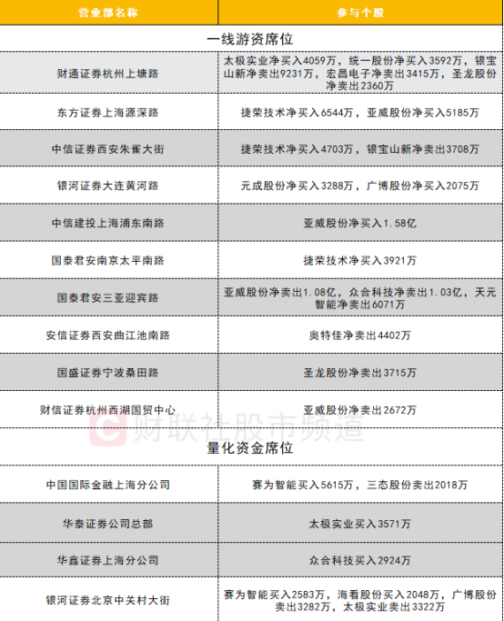 一线游资活跃度有所提升,HBM概念股亚威股份遭一线游资激烈博弈,获两家一线游资买入两家一线游资卖出,其中中信建投上海浦东南路营业部买入1.58亿国泰君安三亚迎宾路卖出1.08亿;捷荣技术获两家一线游资席位买入。