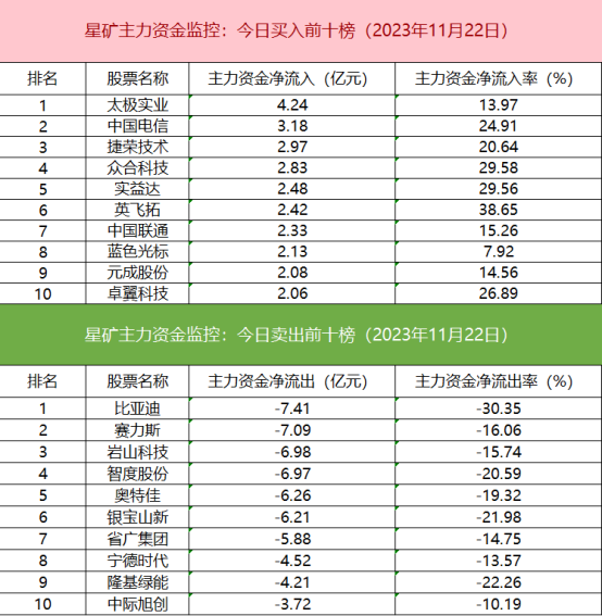 主力资金流出前十的个股所属板块较为杂乱,比亚迪净流出居首。