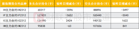 四大期指主力合约中,IH合约多空双方均大幅减仓,且减仓数量基本相当;IF合约多空双方均大幅减仓,空头减仓数量较多;IC合约多空双方均大幅加仓,多头加仓数量较多;IM合约空头加仓,多头小幅减仓。