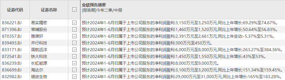 北交所公司半年报业绩预告