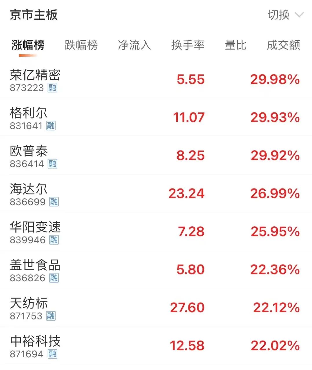 北交所个股涨幅排名