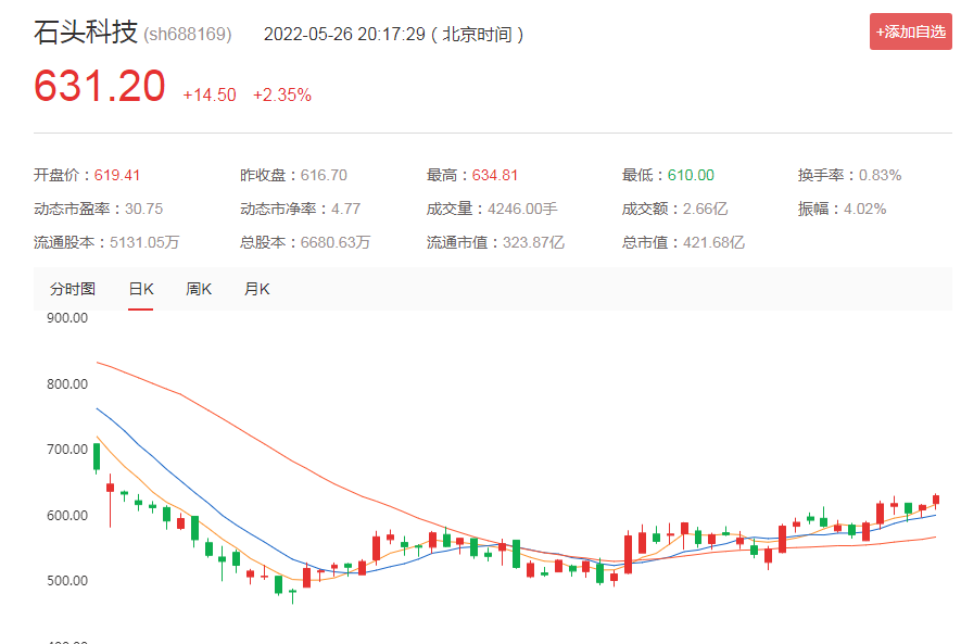 5月26日,石头科技通过集中竞价交易方式,首次回购了2.56万股,购买的最高价为633.66元/股,最低价为613元/股,已支付的总金额为1598.5万元。